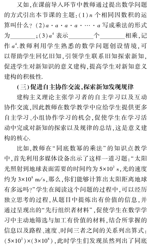 【摘要】相较于传统的教学理念,建构主义教学理论更强调以学生为中心,主张让学生成为主动探索、主动发现以及对知识建构的主体,并认为学习活动是一个共同体行为,交流协作可以有效地促进学习者的知识与技能建构,推动学生从浅层学习走向深度学习,对于学生的核心素养生成有着积极的影响.基于此,文章主要就建构主义下的初(剩余3835字)