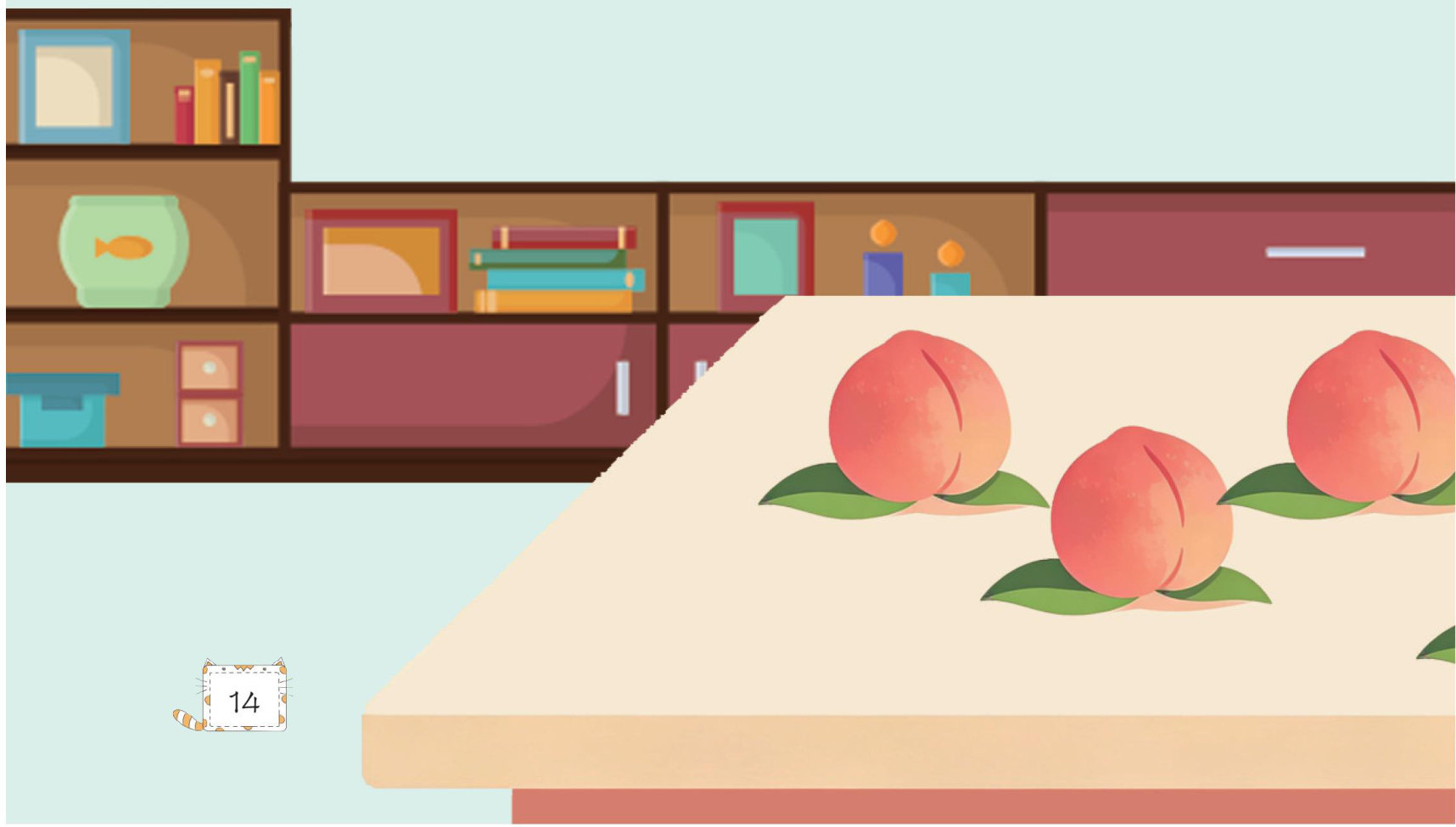 猴妈妈买了一篮桃子,她把桃子放在桌子上便去上班了。