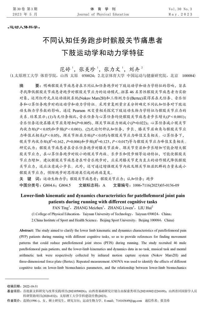 不同认知任务跑步时髌股关节痛患者下肢运动学和动力学特征