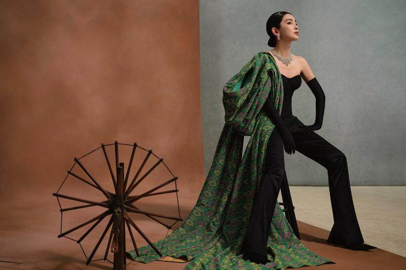 西兰卡普黑色连衣短裙Ming Ma;黑色开衩长裤M Essenrial;黑色袜靴Balcnciaga;项链、耳环均为Cartier Bcautes Du Monde高级珠宝系列;黑色手套私人物品