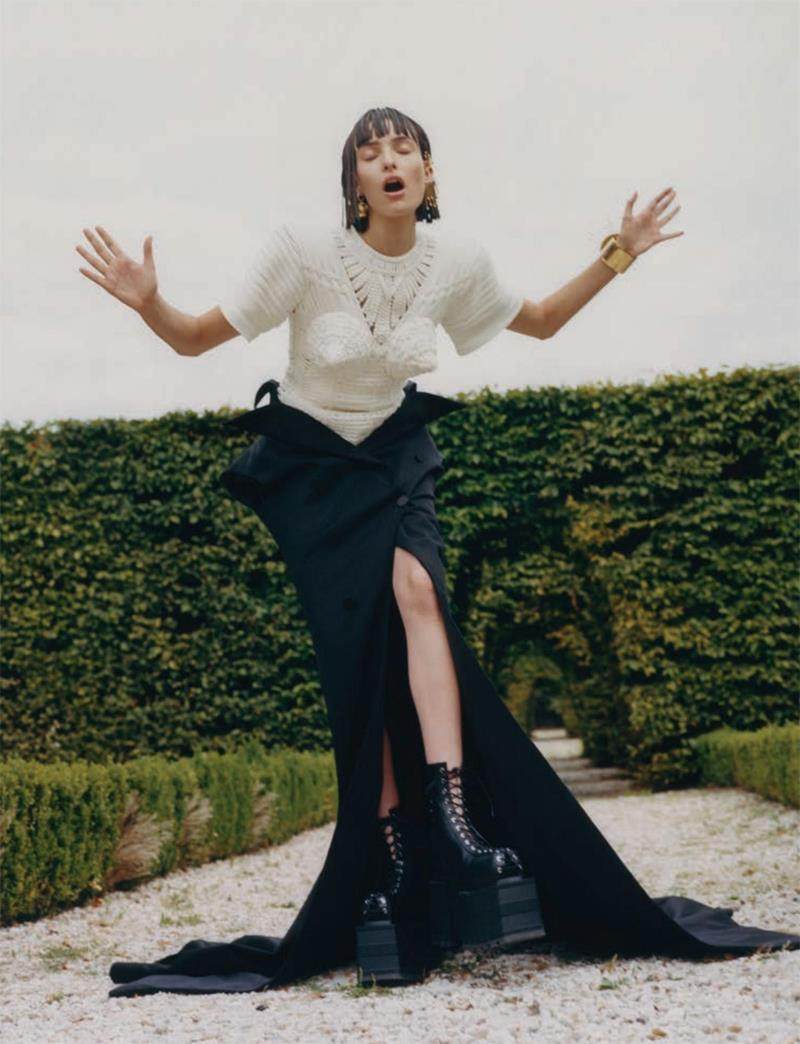 廓形短袖上衣、开衩半身长裙、厚底系带高跟鞋、手镯、金色不对称耳饰均为Jean Paul Gaultier高级定制