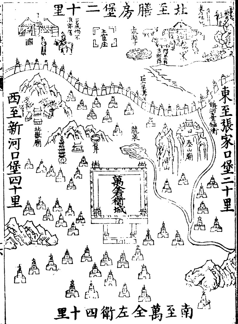 题目中的“万全城”,指明宣镇所辖的万全右卫城,遗址在今河北省张家口市万全区的万全镇。根据明《宣大山西三镇图说》中“万全右卫城图说”记载,该城本德胜口故地,明洪武二十六年(1393年)土筑,明永乐二年(1404年)复移以卫,砖包之。年久砖多损坏,明万历二十七年(1599年)复议砖包。周长六里三十步,高三丈五尺。(剩余3884字)
