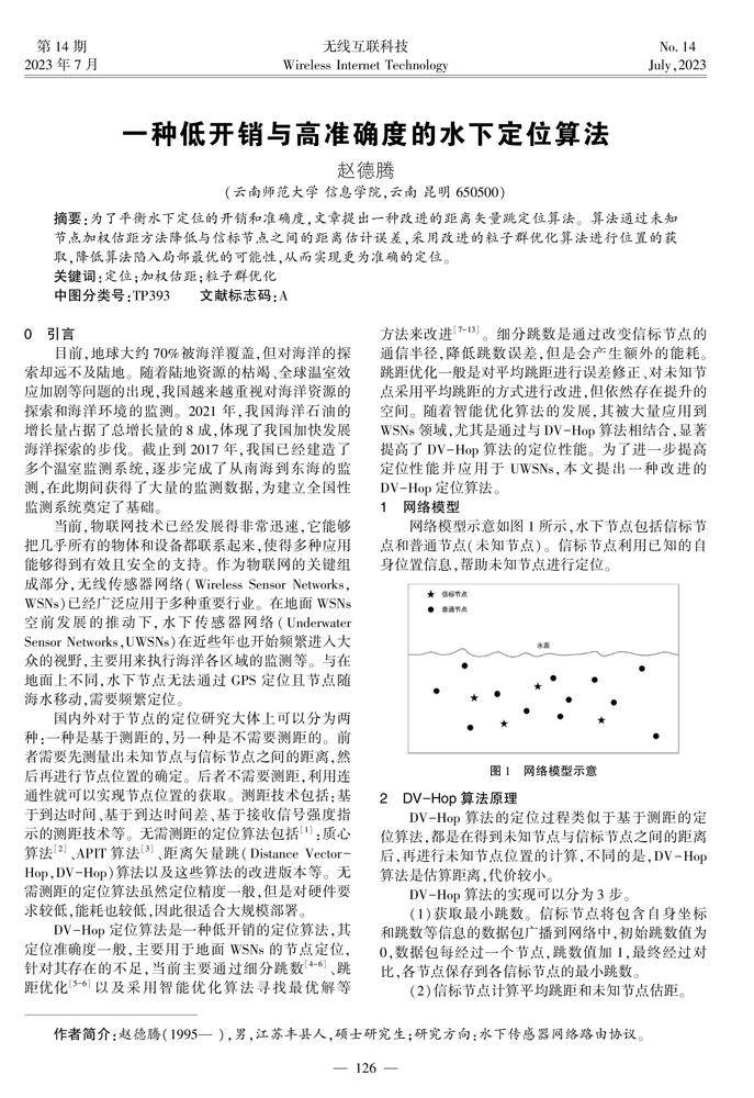 摘要:为了平衡水下定位的开销和准确度,文章提出一种改进的距离矢量跳定位算法。算法通过未知节点加权估距方法降低与信标节点之间的距离估计误差,采用改进的粒子群优化算法进行位置的获取,降低算法陷入局部最优的可能性,从而实现更为准确的定位。
