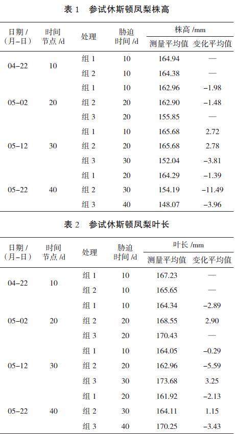 [摘 要] 采用部分控水和完全断水处理(组1、组2在试验期间前期干旱胁迫10 d后进行复水,试验后期完全断水处理;组3试验中全程不给水),对休斯顿凤梨进行干旱胁迫后测定其株高、叶长、叶宽、叶茎直径及质量等,研究休斯顿凤梨的抗旱性。结果表明,植株的质量变化最为明显,其质量明显变轻;经过复水处理的株高变化不明显,全程干旱处理的组3植株明显变矮;组1、组2、组3的植株叶片都明显内卷,叶片长度和宽度都整体呈减少趋势,是植物普遍缺水的征兆;组3的叶片内卷尤其明显,而叶茎直径变化最不明显。(剩余3530字)