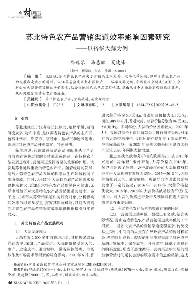 [关键词] 苏北特色农产品;营销渠道;层次分析法