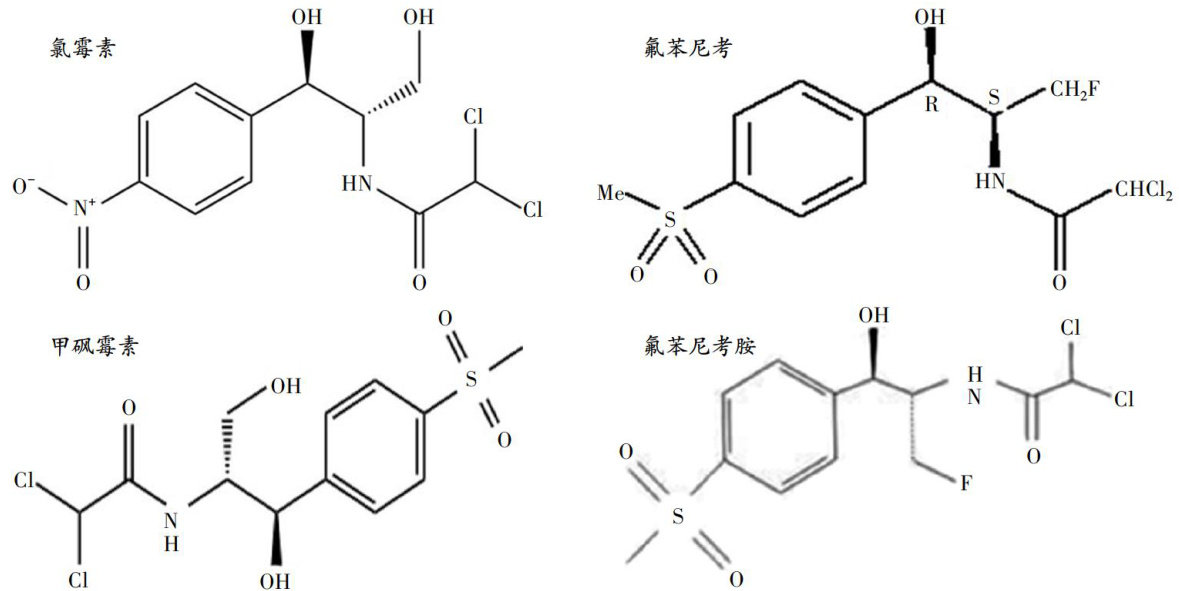 酰胺醇类药物属于广谱抗生素,对革兰氏阴性菌有较强抑制作用,对革兰氏阳性菌作用较弱。其抑菌作用机理是与细菌核糖体结合,使蛋白质合成受阻。常见的酰胺醇类药物有氯霉素(chloramphenicol,CAP)、氯霉素衍生物氟苯尼考(florfenicol,FF)和甲砜霉素(thiamphenicol,TAP)、氟苯尼考代谢产物氟苯尼考胺(florfenicolamine,FFA)[1-3],其化学结构如图1所示。(剩余7345字)
