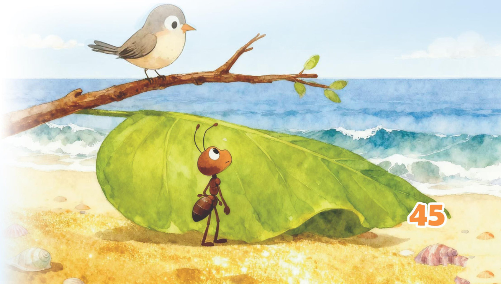 小蚂蚁的话被一只小蝴蝶听见了。好心的小蝴蝶飞过来对小蚂蚁说:“要不然我带你去看看?”小蚂蚁看了小蝴蝶一眼,皱着眉说:“还是算了吧,海浪那么大,你这么小,万一一个海浪打过来,咱们两个都掉进海里怎么办?还是让我再想想吧!”