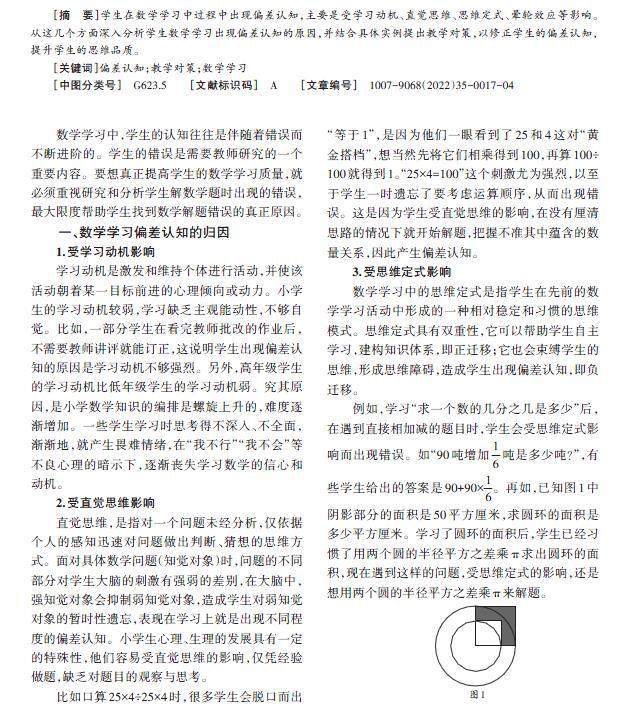 [摘 要]学生在数学学习中过程中出现偏差认知,主要是受学习动机、直觉思维、思维定式、晕轮效应等影响。从这几个方面深入分析学生数学学习出现偏差认知的原因,并结合具体实例提出教学对策,以修正学生的偏差认知,提升学生的思维品质。