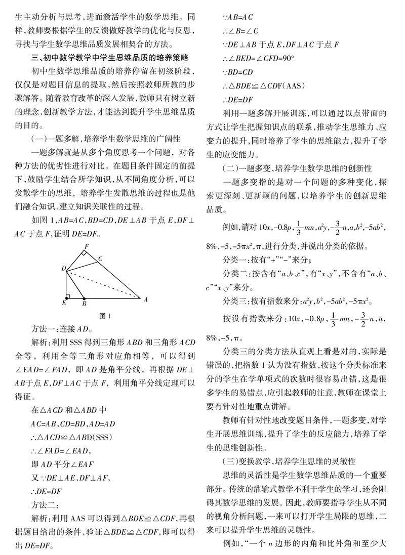 数学作为初中阶段的一门基础学科,是培养学生数学思维品质的有效路径,需要教师利用好。思维品质优秀的,表现为能够积极应对各种问题,反之则不尽如人意。如何在数学教学活动中培养学生的数学思维品质成了教师深入探索的问题。