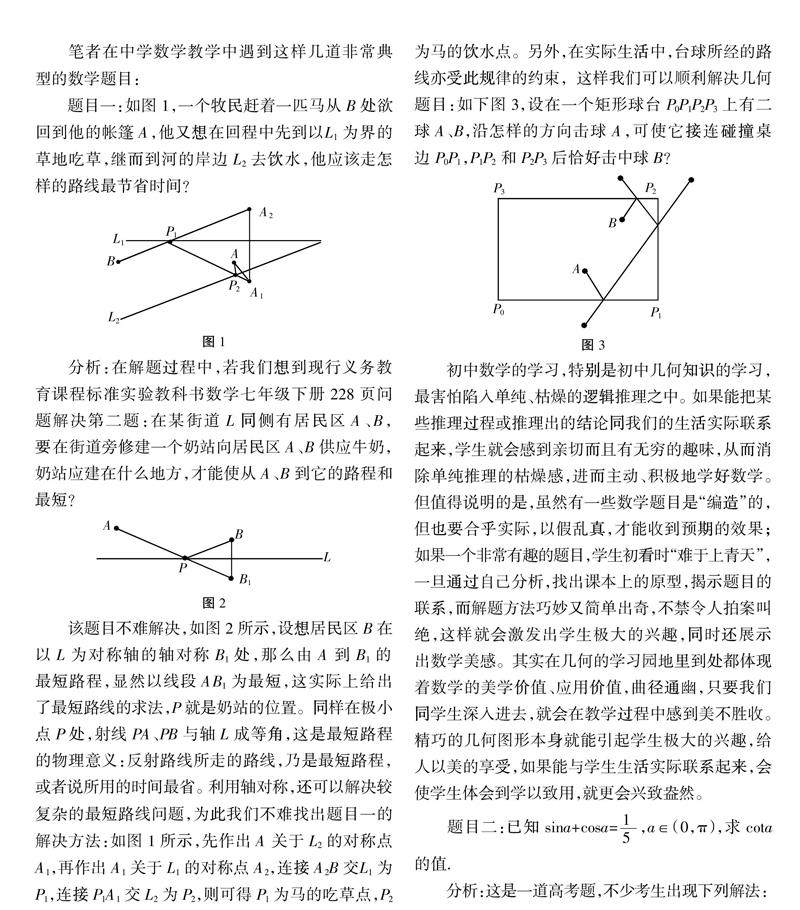 题目一:如图1,一个牧民赶着一匹马从B处欲回到他的帐篷A,他又想在回程中先到以L1为界的草地吃草,继而到河的岸边L2去饮水,他应该走怎样的路线最节省时间?