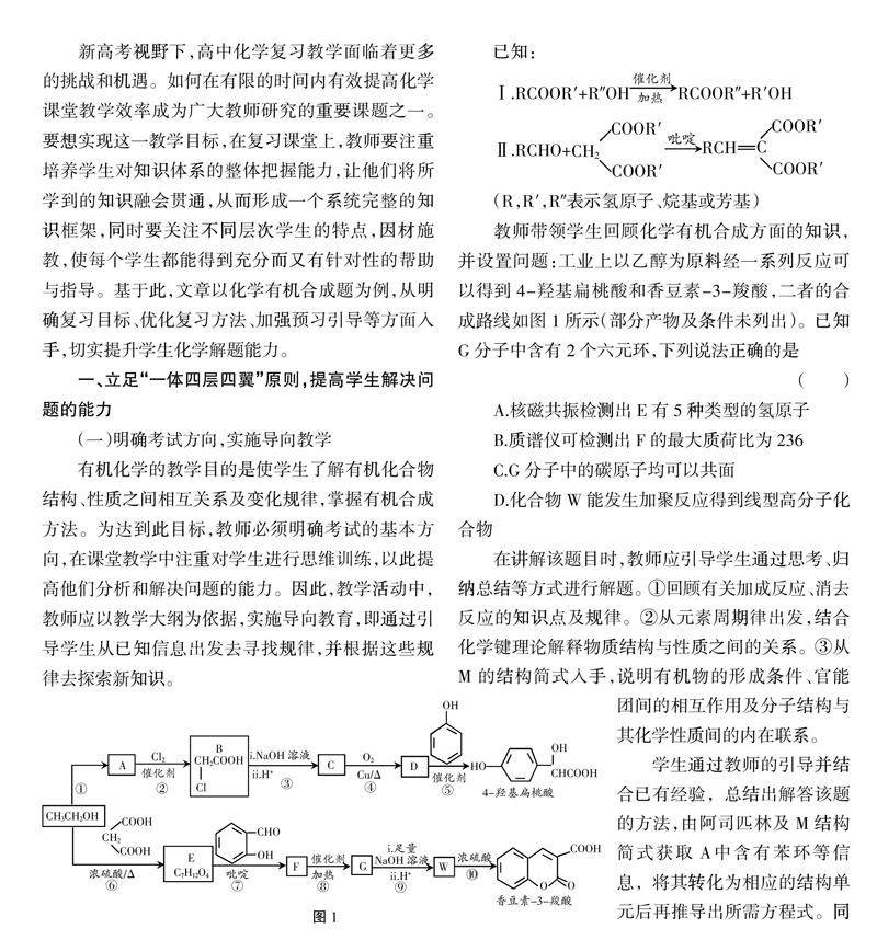 新高考视野下,高中化学复习教学面临着更多的挑战和机遇。如何在有限的时间内有效提高化学课堂教学效率成为广大教师研究的重要课题之一。要想实现这一教学目标,在复习课堂上,教师要注重培养学生对知识体系的整体把握能力,让他们将所学到的知识融会贯通,从而形成一个系统完整的知识框架,同时要关注不同层次学生的特点,因材施教,使每个学生都能得到充分而又有针对性的帮助与指导。(剩余4285字)