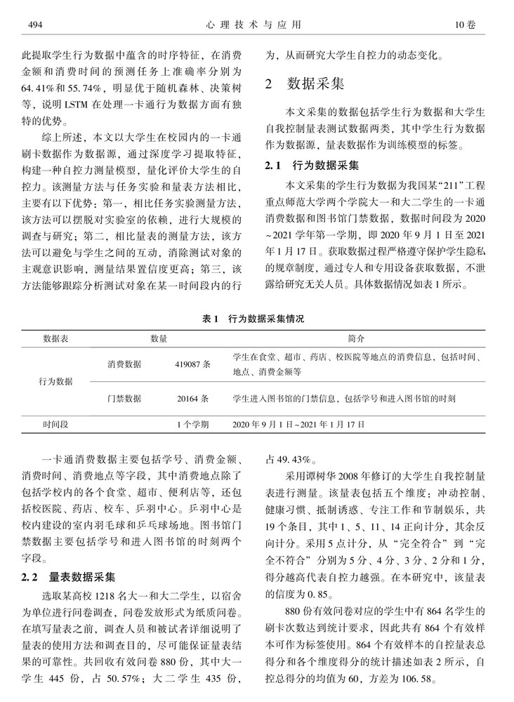 摘要 自我控制能力(自控力)是个体适应社会、达成人生目标的一项重要能力。但目前心理学常用的任务实验和量表等方法需要消耗大量的时间成本和人力资源,同时研究对象的主观意识会影响评价结果的置信度。文章提出了一种基于深度学习LSTM(Long Short-Term Memory)模型的自控力量化评价方法,该方法以大学生在校园内的一卡通行为数据为数据源,利用LSTM模型提取行为数据时序特征,在测试数据集上自控力评价结果与心理学量表法测量结果的相关系数为0.66,且能够消除研究对象的主观影响,适合学校进行大规模的学生自控力测评,具有重要的应用前景。(剩余9295字)