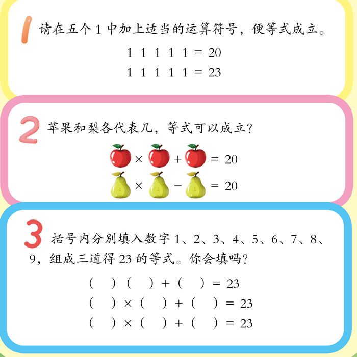 括号内分别填入数字1、2、3、4、5、6、7、8、9,组成三道得23的等式。(剩余12字)
