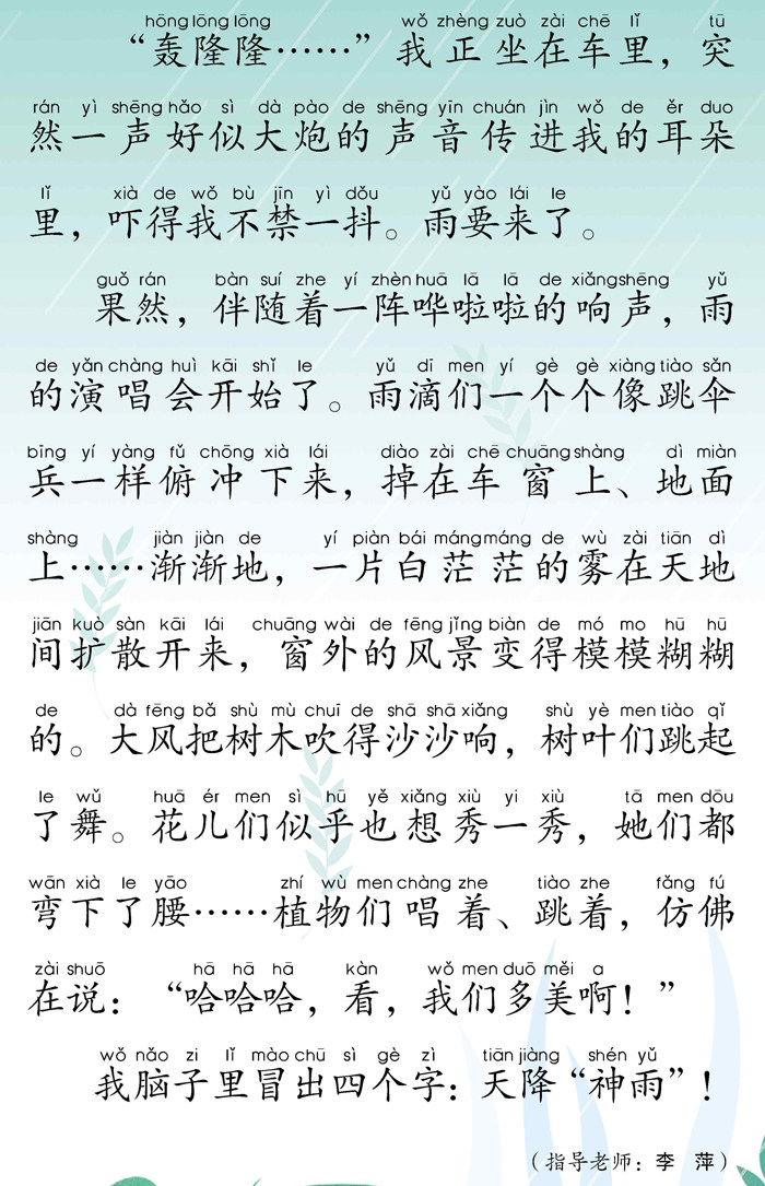 果然,伴随着一阵哗啦啦的响声,雨的演唱会开始了。雨滴们一个个像跳伞兵一样俯冲下来,掉在车窗上、地面上……渐渐地,一片白茫茫的雾在天地间扩散开来,窗外的风景变得模模糊糊的。大风把树木吹得沙沙响,树叶们跳起了舞。(剩余80字)
