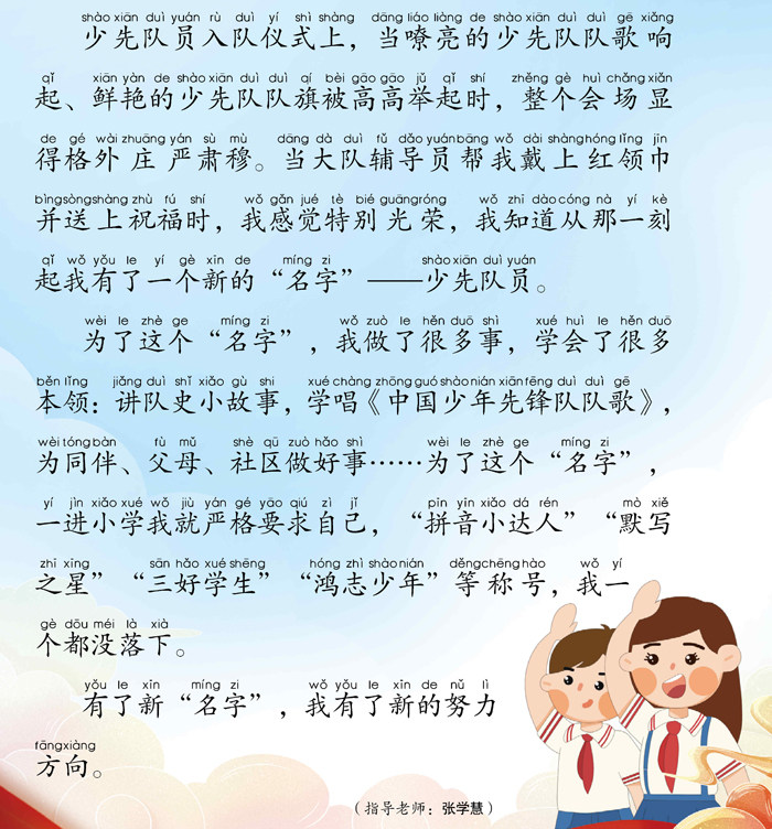 为了这个“名字”,我做了很多事,学会了很多本领:讲队史小故事,学唱《中国少年先锋队队歌》,为同伴、父母、社区做好事……为了这个“名字”,一进小学我就严格要求自己,“拼音小达人”“默写之星”“三好学生”“鸿志少年”等称号,我一个都没落下。(剩余33字)