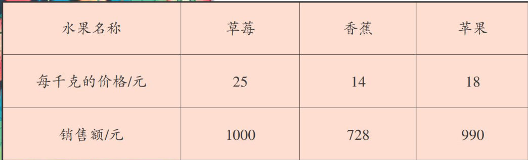 不少同学认为,三种水果中草莓最畅销。因为从表中可以看出,草莓、香蕉和苹果的销售额分别是1000元、728元、990元, 1000>990> 728,草莓的销售额最多,所以草莓最畅销。