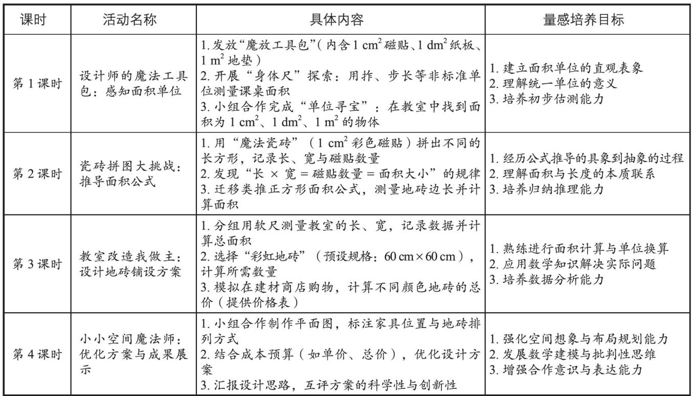 《义务教育数学课程标准(2022年版)》明确将“量感”列为小学数学核心素养之一,强调学生应具备对事物可测量属性及大小关系的直观感知能力。主题式学习以其跨学科整合、情境化实践等特点,为学生的量感培养提供了新的思路。本文以苏教版数学三年级下册“长方形和正方形的面积”单元为载体,通过设计“小小设计师”主题活动,引导学生在为教室设计地砖铺设方案的过程中,经历“感知一探究一应用”的完整学习过程,实现量感的深度发展。(剩余2695字)