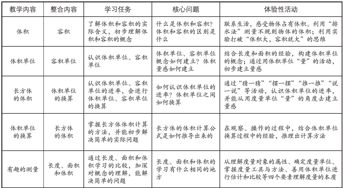新课标明确指出,教师需要改变传统的课时教学设计,推进单元整体教学设计,以体现数学知识的内在逻辑和核心素养的关联。教师通过整体分析单元数学内容和学生认知规律,合理整合教学资源,明确单元教学目标,并落实到各个教学环节中。整体设计,分步实施,促进学生对数学内容的全面理解与把握,逐步培养核心素养。量感是核心素养的主要表现之一,它需要学生从理解度量对象的属性、确定度量单位、掌握度量工具与方法、善用体积单位进行估计和比较等四个要素理解度量的本质。(剩余3447字)