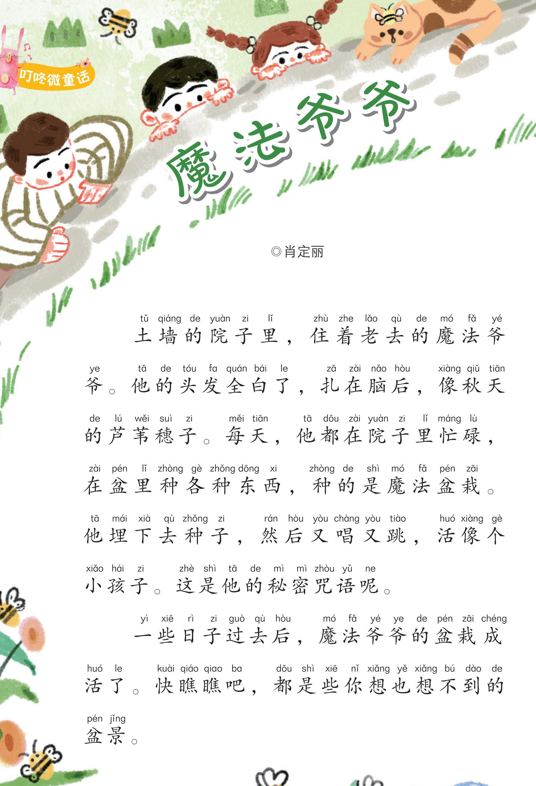 土墙的院子里,住着老去的魔法爷爷。他的头发全白了,扎在脑后,像秋天的芦苇穗子。每天,他都在院子里忙碌,在盆里种各种东西,种的是魔法盆栽。他埋下去种子,然后又唱又跳,活像个小孩子。这是他的秘密咒语呢。