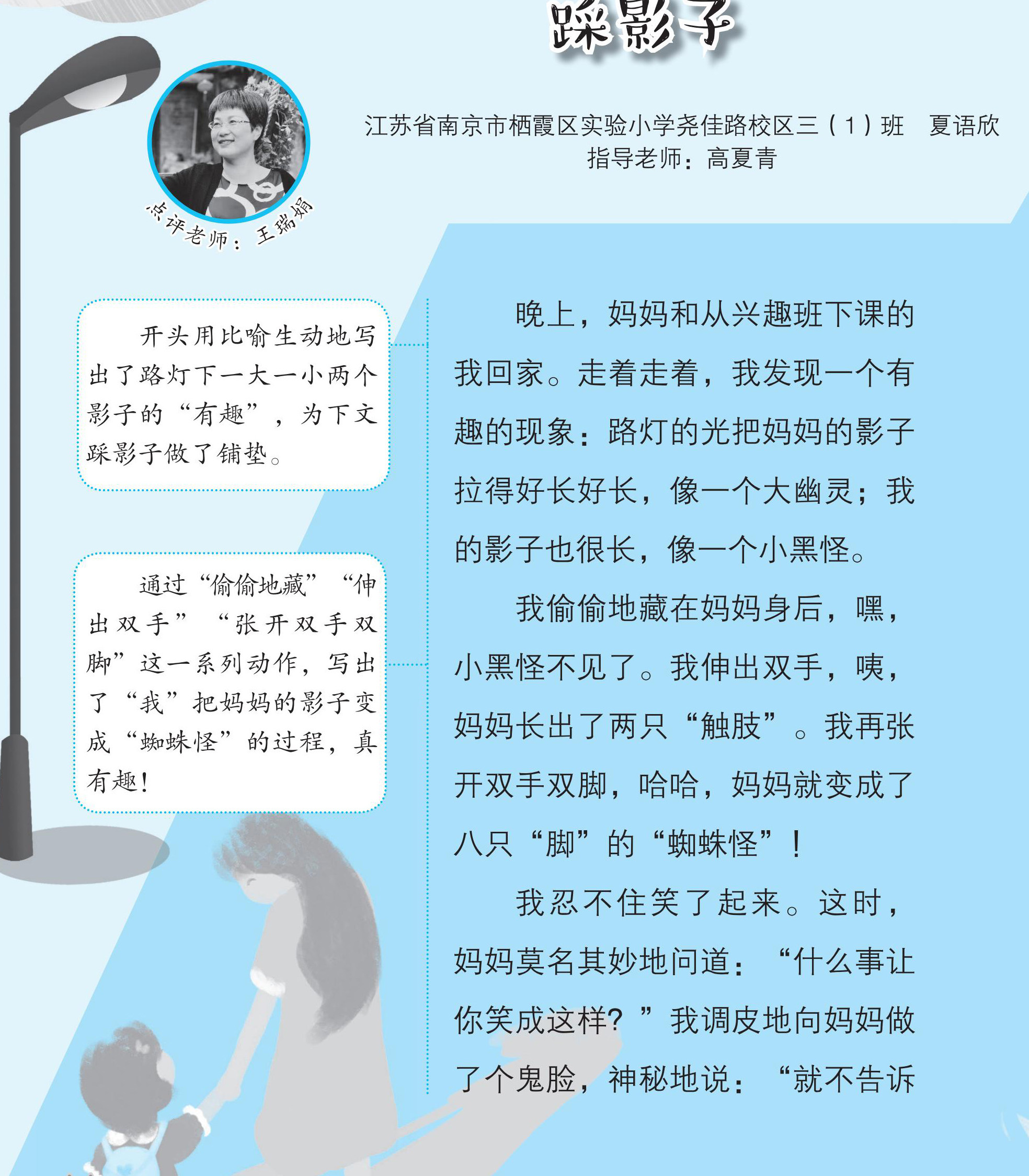 晚上,妈妈和从兴趣班下课的我回家。走着走着,我发现一个有趣的现象:路灯的光把妈妈的影子拉得好长好长,像一个大幽灵;我的影子也很长,像一个小黑怪。