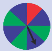 问题1:把一个圆形转盘平均分成8份,其中1份涂上红色,3份涂上绿色,4份涂上蓝色,如右图。如果转动指针,落在哪个颜色区域的可能性最大?落在哪个颜色区域的可能性最小?