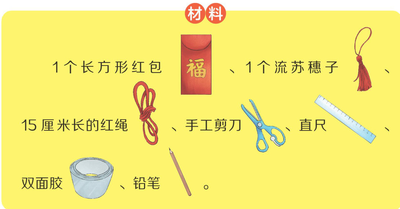 按图片将红包整齐地剪成两张纸;用尺子测量,在稍窄的那张纸上每隔1厘米画一条线;沿画的线仔细剪开,注意两边各保留2厘米不剪断。(剩余407字)