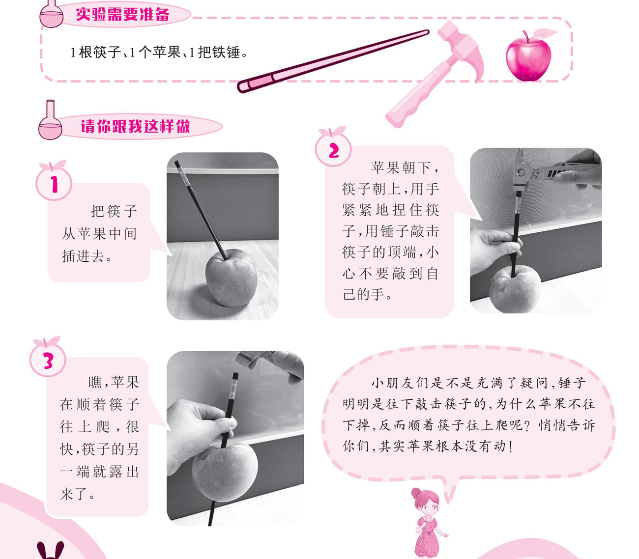 这是一个关于惯性的小实验。当筷子插过苹果的中心时,筷子与苹果之间是有接触且相对静止的。这时,我们用铁锤往下敲筷子的顶端,筷子瞬间受力并向下运动,而苹果由于惯性仍停留在原位。(剩余150字)