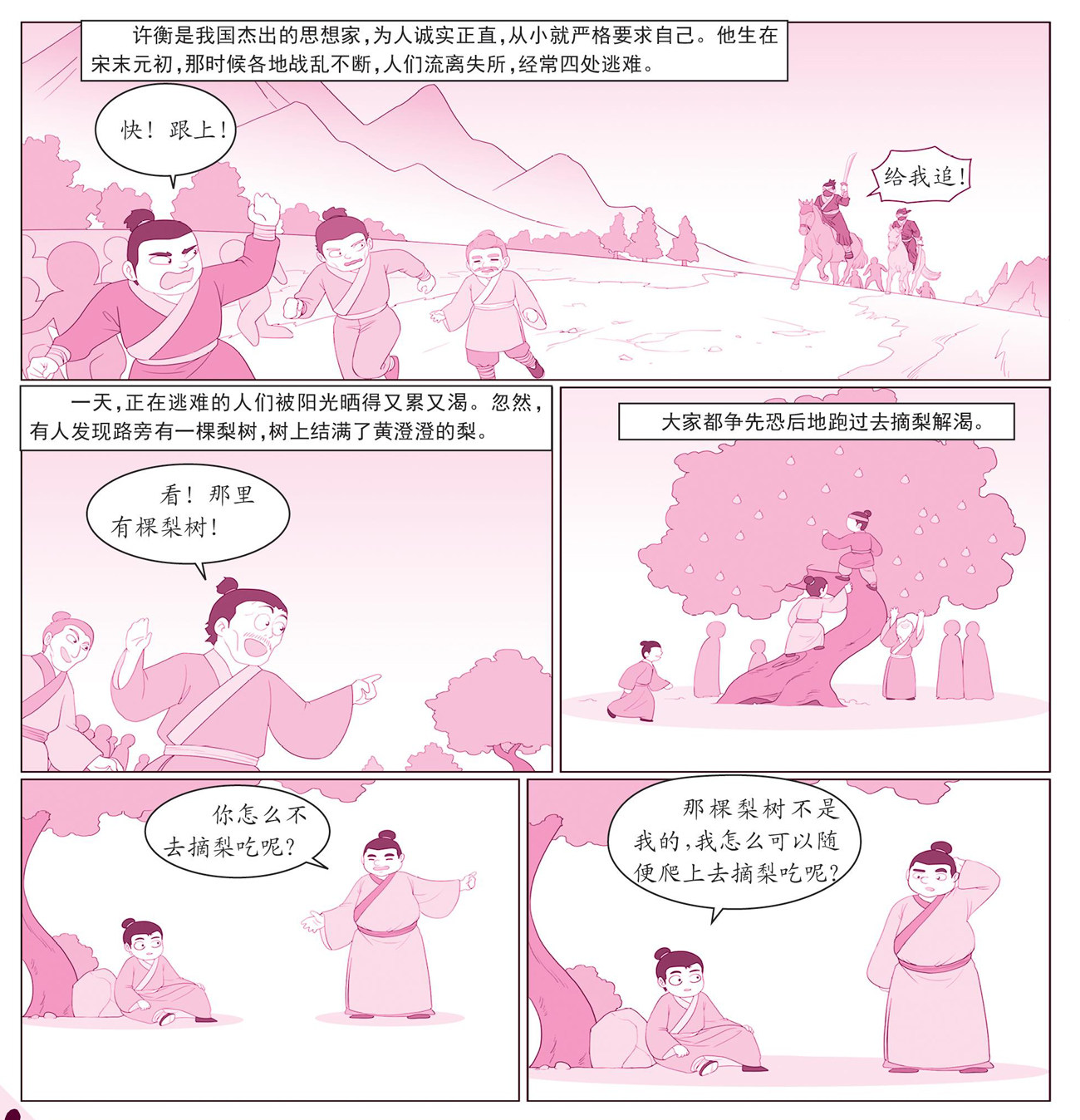【原文】尝暑中过河阳,渴甚,道有梨,众争取啖之,衡独危坐树下自若。或问之,曰:“非其有而取之,不可也。”人曰:“世乱,此无主。”曰:“梨无主,吾心独无主乎?”