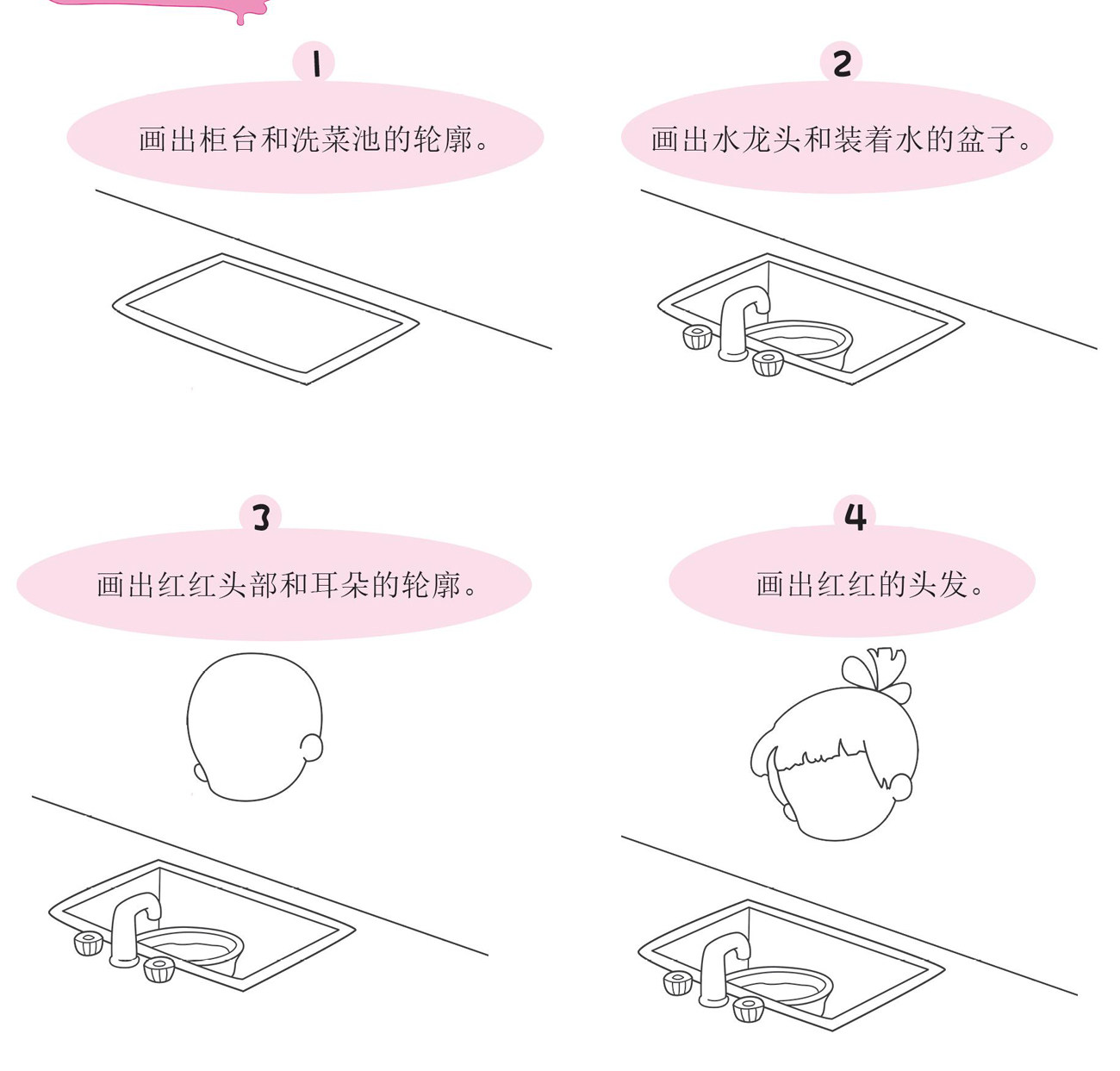 过年啦!全家人都在为年夜饭忙碌着,红红也想出一份力,干点什么好呢?有了,洗青菜吧。说干就干,红红撸起袖子,打开水龙头,洗了起来。瞧,她洗得多认真呀!下面咱们就把这一幕画下来吧。