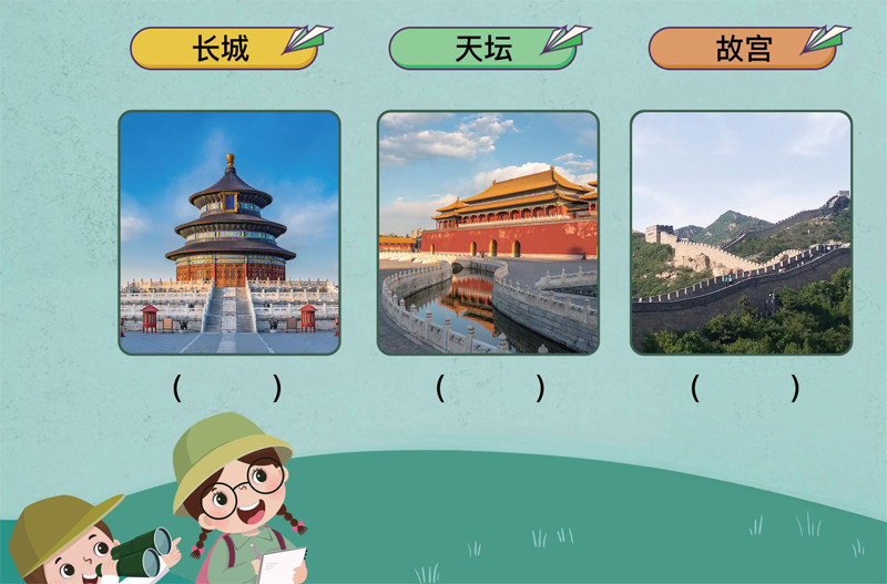 乐lè迪dí和hé小xiǎo伙huǒ伴bàn们men打dǎ算suàn一yì起qǐ去qù旅lǚ行xínɡ,他tā们men首shǒu先xiān到dào北běi京jīnɡ游yóu览lǎn了le许xǔ多duō景jǐnɡ点diǎn。小xiǎo朋pénɡ友you,请qǐnɡ你nǐ把bǎ景jǐnɡ点diǎn名mínɡ称chēnɡ填tián在zài对duì应yìnɡ图tú片piàn下xià的de括kuò号hào里lǐ吧bɑ!