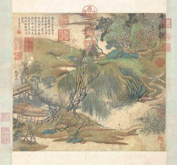 这幅画描绘了池畔的村屋景象。一名文人手持拐杖,沿着小径,在青葱的田野间漫步。(剩余37字)