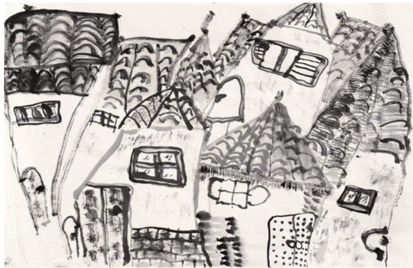2.成为“水墨小能手”,学习用中锋勾勒房子外形,侧锋皴擦出墙面的粗糙质感,感受墨色的浓淡变化。