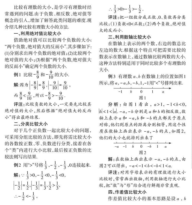 比较有理数的大小,是学习有理数时经常遇到的问题.由于负数、相反数、绝对值等概念的引入,增加了解答此类问题的难度.现介绍几种比较有理数大小的方法.