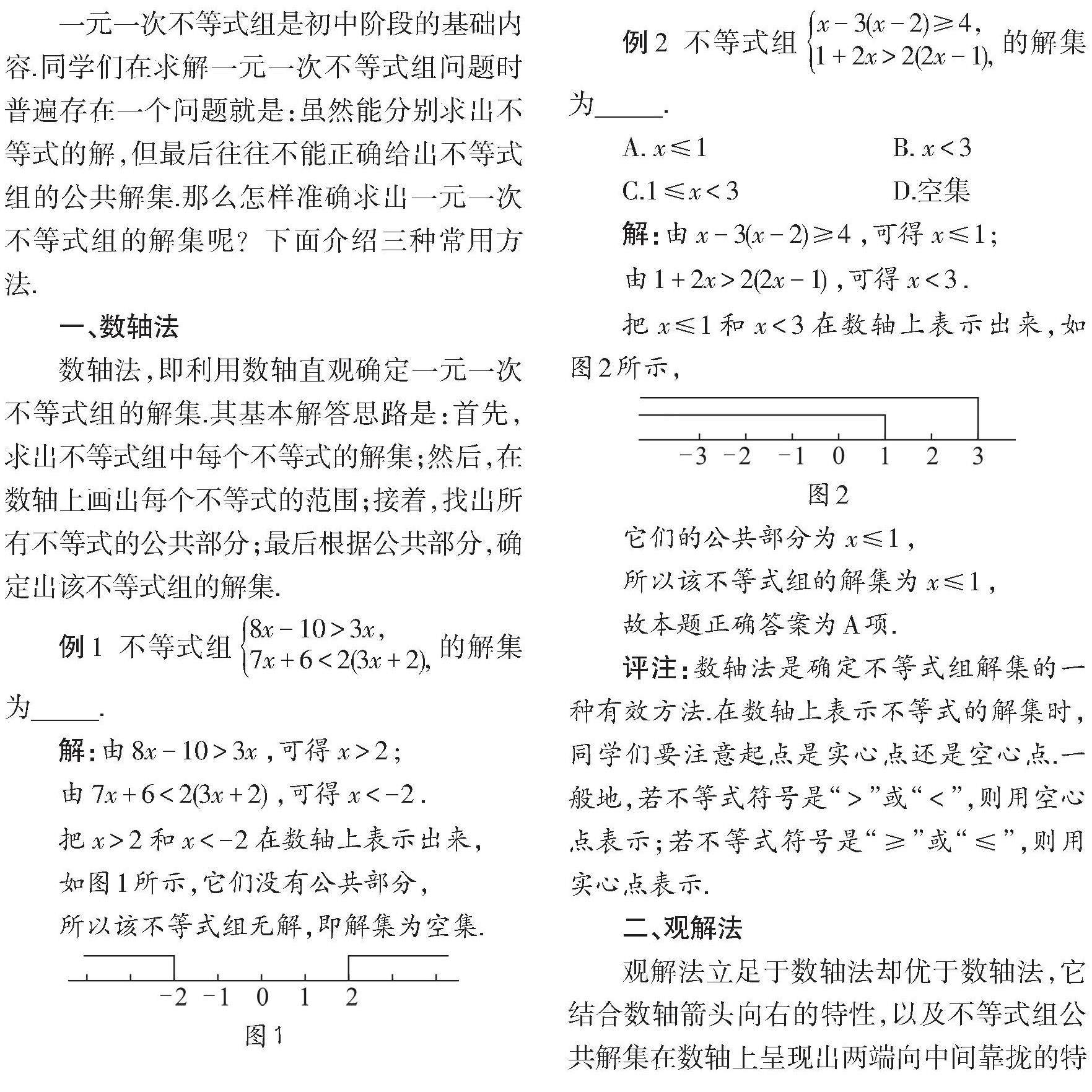 一元一次不等式组是初中阶段的基础内容.同学们在求解一元一次不等式组问题时普遍存在一个问题就是:虽然能分别求出不等式的解,但最后往往不能正确给出不等式组的公共解集.那么怎样准确求出一元一次不等式组的解集呢?下面介绍三种常用方法.