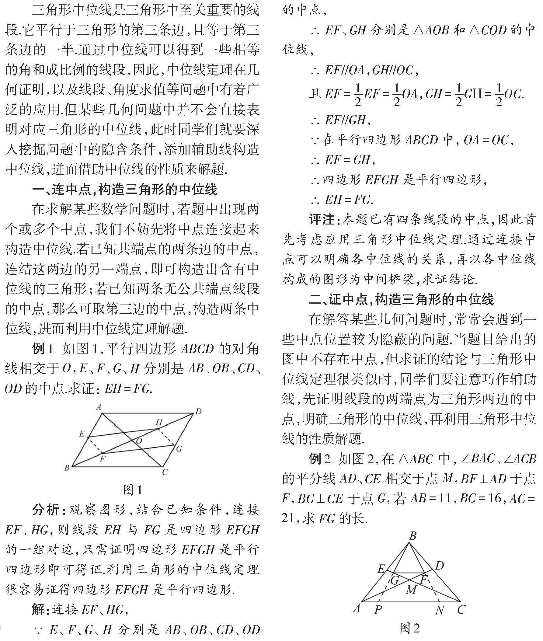 三角形中位线是三角形中至关重要的线段.它平行于三角形的第三条边,且等于第三条边的一半.通过中位线可以得到一些相等的角和成比例的线段,因此,中位线定理在几何证明,以及线段、角度求值等问题中有着广泛的应用.但某些几何问题中并不会直接表明对应三角形的中位线,此时同学们就要深入挖掘问题中的隐含条件,添加辅助(剩余2044字)