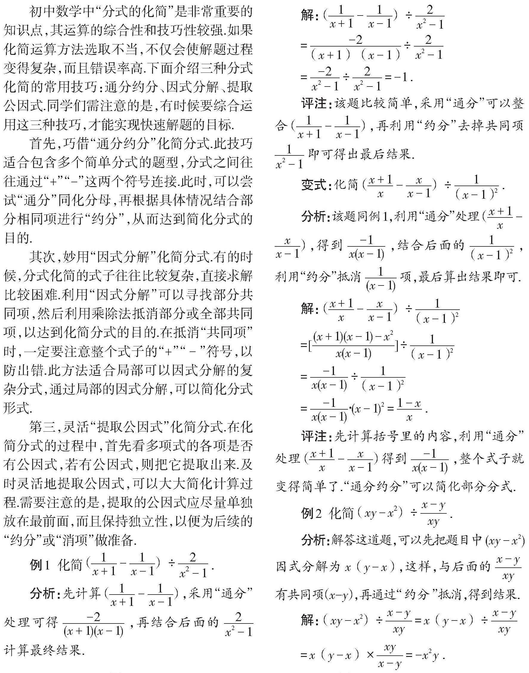 初中数学中“分式的化简”是非常重要的知识点,其运算的综合性和技巧性较强.如果化简运算方法选取不当,不仅会使解题过程变得复杂,而且错误率高.下面介绍三种分式化简的常用技巧:通分约分、因式分解、提取公因式.同学们需注意的是,有时候要综合运用这三种技巧,才能实现快速解题的目标.