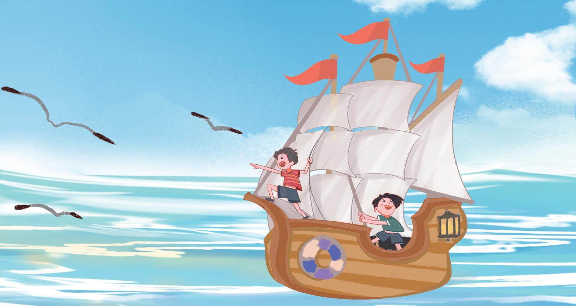 我们几个人坐在一条精美华丽的小船上。白色的风帆鼓了起来,宛似天鹅的胸膛,帆的上面挂着几面随风轻飏(yánɡ)的小旗。