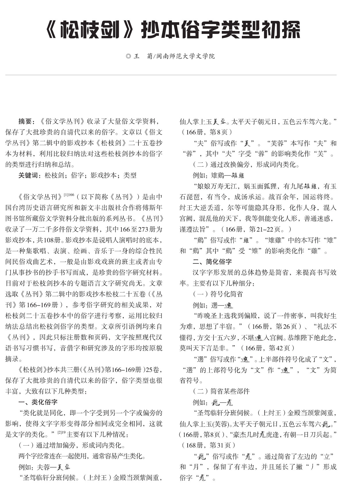 摘要:《俗文学丛刊》收录了大量俗文学资料,保存了大批珍贵的自清代以来的俗字。文章以《俗文学丛刊》第二辑中的影戏抄本《松枝剑》二十五卷抄本为材料,利用比较归纳法对这些松枝剑抄本的俗字的类型进行归纳和总结。