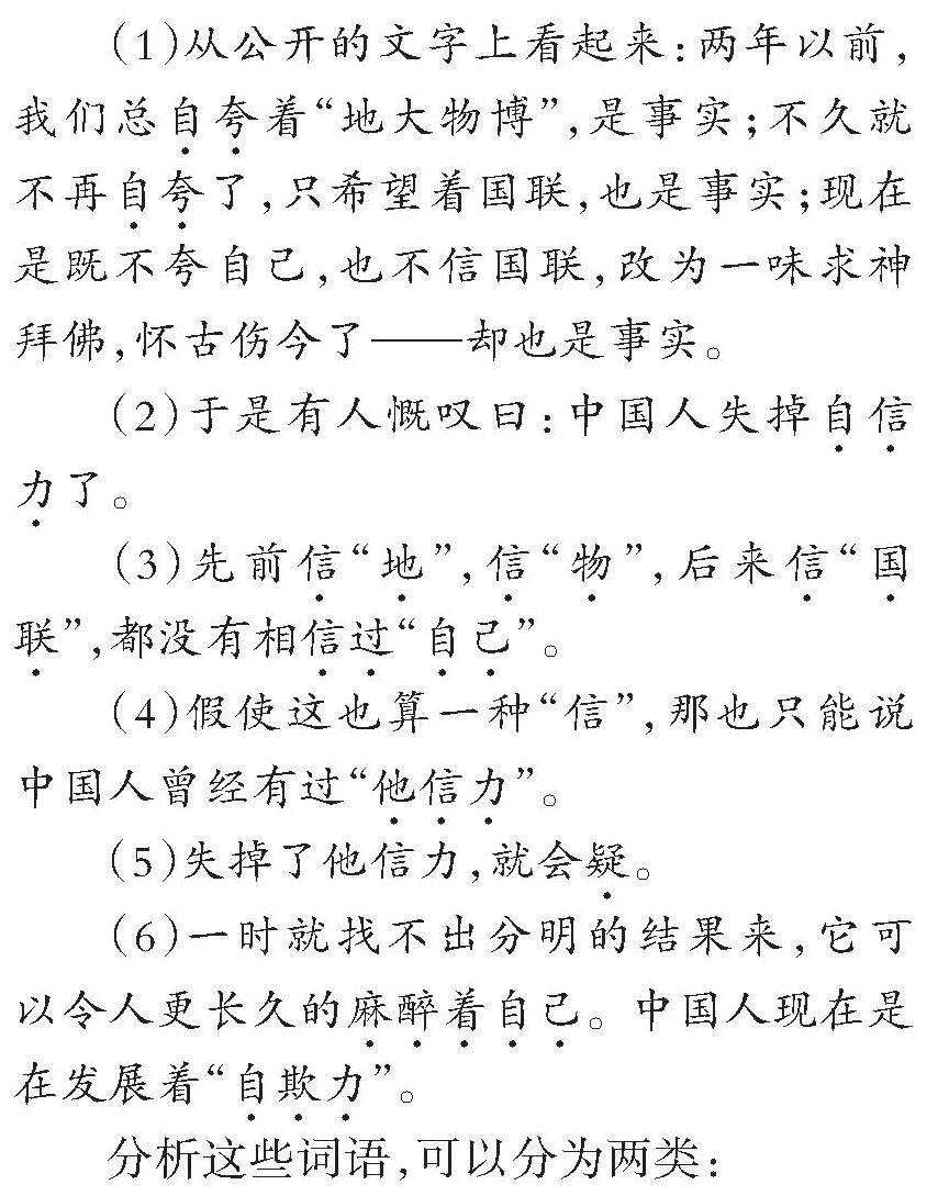 摘要:《中国人失掉自信力了吗》是鲁迅的一篇经典杂文,统编本教材收录在初中议论文单元。以往教师多从文章结构出发阐述驳论文的一般特点。本文尝试另辟蹊径,从语言学角度入手,带领学生细读文本。先从言语行为的预设理论出发,带领学生把握这篇驳论文明确的观点和鲜明的立场;再用语义网络理论解读标题中的关键词“自信力”,构建鲁迅先生独特的以关键词“自信”为中心的语义网络图;然后通过义素分析法品味这些语义相近、相反、相关的词语,辨析语义,进而把握鲁迅先生驳论文的思维路径,培养学生批判性思维的能力。(剩余4792字)