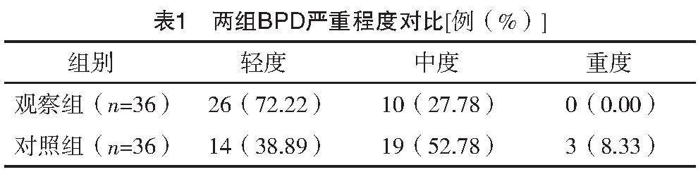 【摘要】 目的:探讨糖皮质激素治疗早产儿支气管肺发育不良(BPD)的临床效果。方法:选取2020年6月—2022年6月新余市人民医院新生儿重症监护病房(NICU)收治的72例BPD患儿,按随机数字表法分为两组,各36例。对照组予以常规治疗,观察组加用糖皮质激素治疗。比较两组BPD严重程度、临床指标、血气指标、炎症因子及并发症发生情况。(剩余8114字)