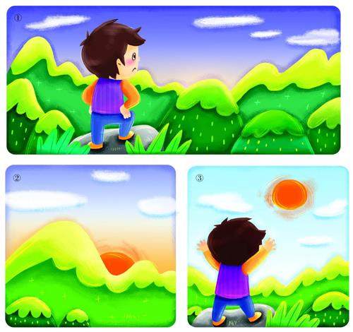 图③:图中小男孩看日出时,心情是什么样的?