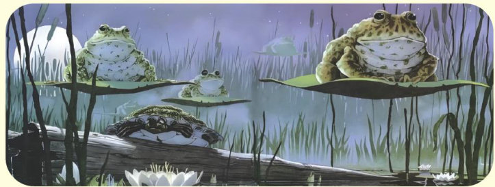 这天是星期二,晚上8点左右,在一个寂静的池塘里,一大群青蛙坐在荷叶上飞了起来。
