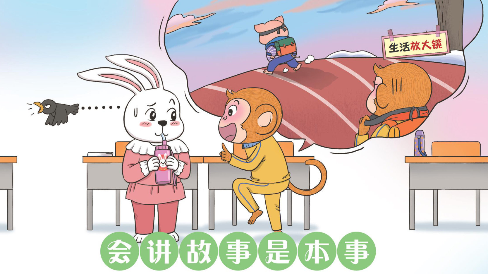 ‘萌小兔,我给你讲 一个精彩的故事呗,你想 听不?”刚下课,淘小猴 就神神秘秘地凑到萌小兔 身边说。