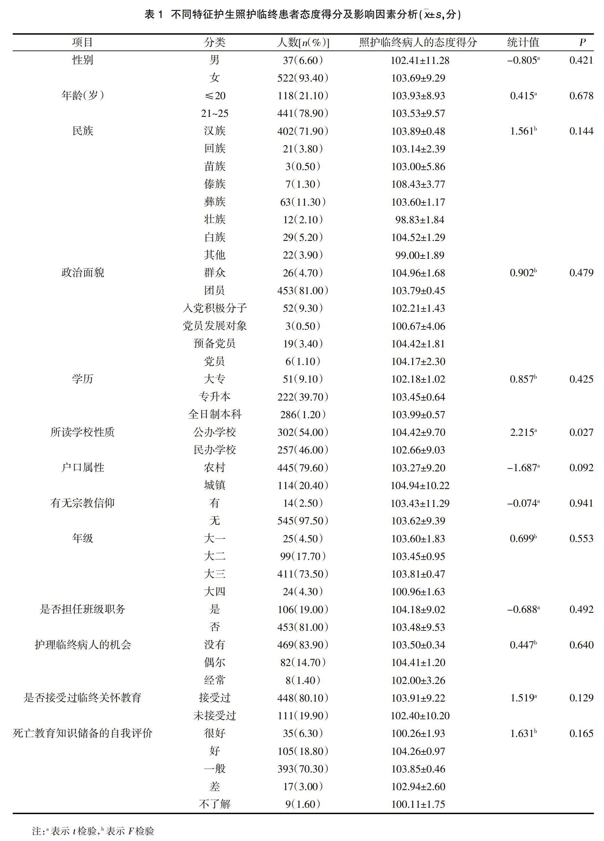 云南省护生照护临终患者的态度现状调查及影响因素分析