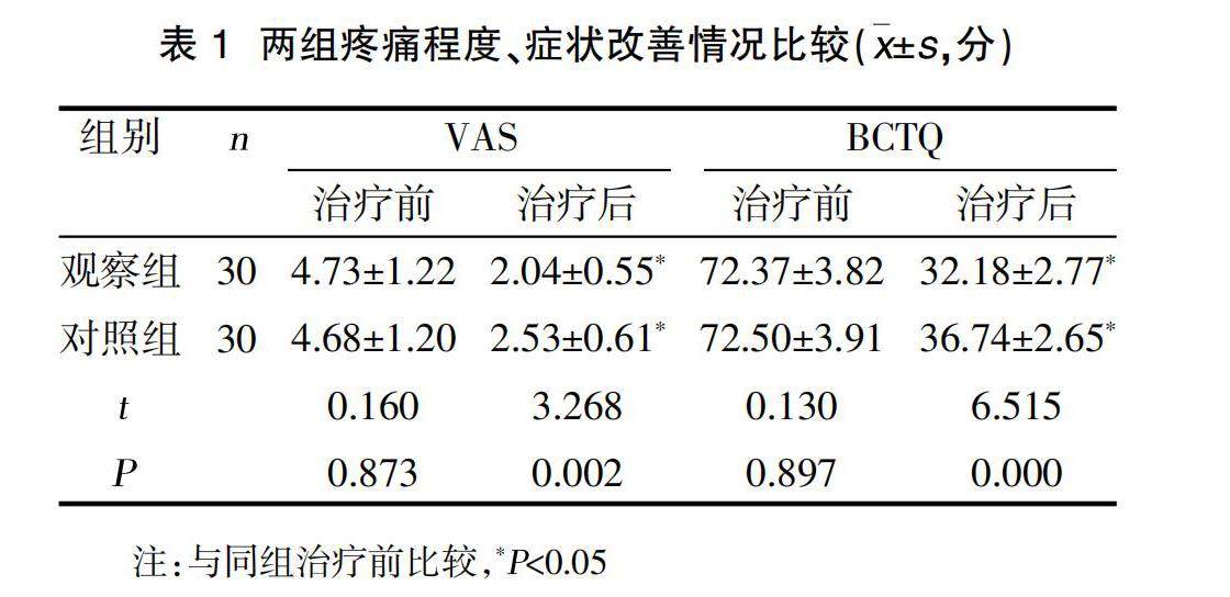 摘要:目的 探究神经松动术联合关节松动术对轻中度原发性腕管综合征(CTS)患者疼痛及症状的影响。方法 以2021年9月-2022年8月北京按摩医院收治的60例轻中度CTS患者为研究对象,按照随机数字表法分为对照组(30例)与观察组(30例)。对照组给予关节松动术治疗,观察组应用神经松动术联合关节松动术治疗,比较两组治疗前后疼痛程度[视觉模拟评分(VAS)]、症状改善情况[波士顿腕管问卷调查表(BCTQ)评分]、腕管压力(休息位、握拳位)、上肢关节功能(Fugl-Meyer上肢功能评分、Mayo腕关节功能评分)、电生理指标[正中神经感觉传导速度(SCV)、正中神经运动传导速度(MC)]。(剩余8681字)