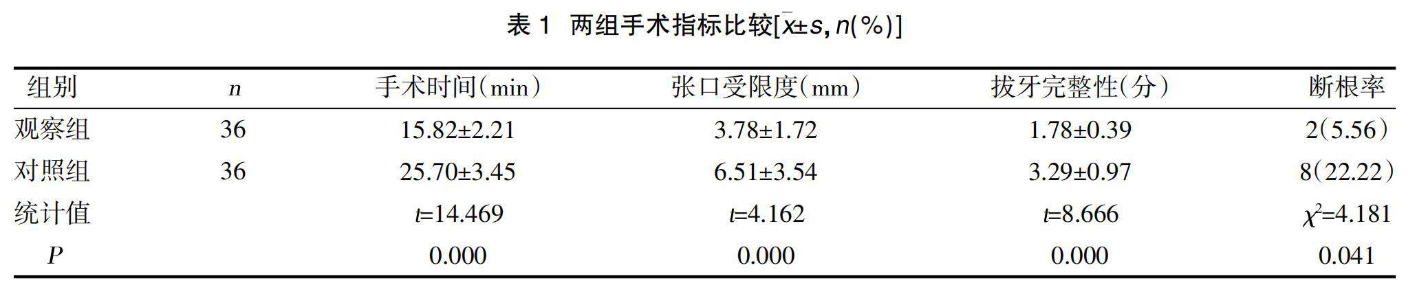 摘要:目的 探讨高速涡轮牙钻及微创拔牙刀在阻生智齿拔除术中的临床作用。方法 纳入2021年9月-2022年9月婺源县妇幼保健院口腔科收治的72例阻生智齿患者,按照随机数字表法分为对照组(36例)和观察组(36例)。对照组行传统智齿拔除术,观察组则应用高速涡轮牙钻联合微创拔牙刀完成智齿拔除,比较两组手术指标(手术时间、张口受限度、拔牙完整性、断根率)、患者术后肿胀度、疼痛度[视觉模拟评分(VAS)]及畏惧度[牙科恐惧症调查量表(DFS)]、术后并发症、拔牙满意度。(剩余8285字)