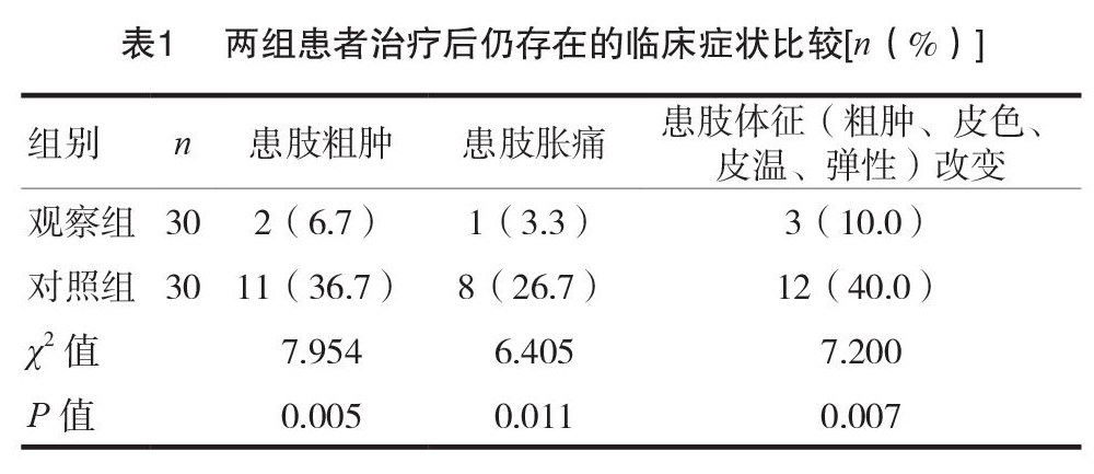 [摘要]目的探讨四通胶囊治疗下肢深静脉血栓(DVT)形成的临床疗效。方法选择2019年6月至2021年9 月在泰安市中医二院外科住院治疗的湿热下注证 DVT 患者60例为研究对象。按照随机数字表法分为观察组( n=30)和对照组( n=30)。观察组给予四通胶囊,对照组给予血塞通片,比较治疗后两组患者仍存在的临床症状情况、实验室指标及患侧肢体周径差变化,统计两组治疗安全性和临床效果。(剩余8339字)