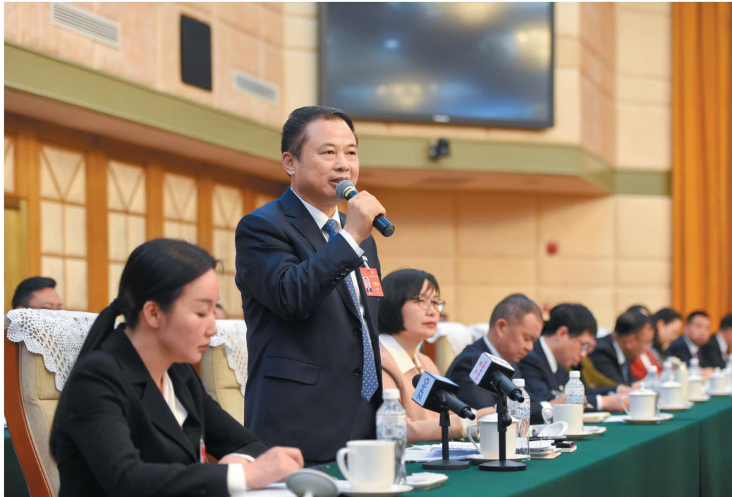 在十四届全国人大二次会议的浙江代表团全团会议上,张天任(左二)正在作审议发言。