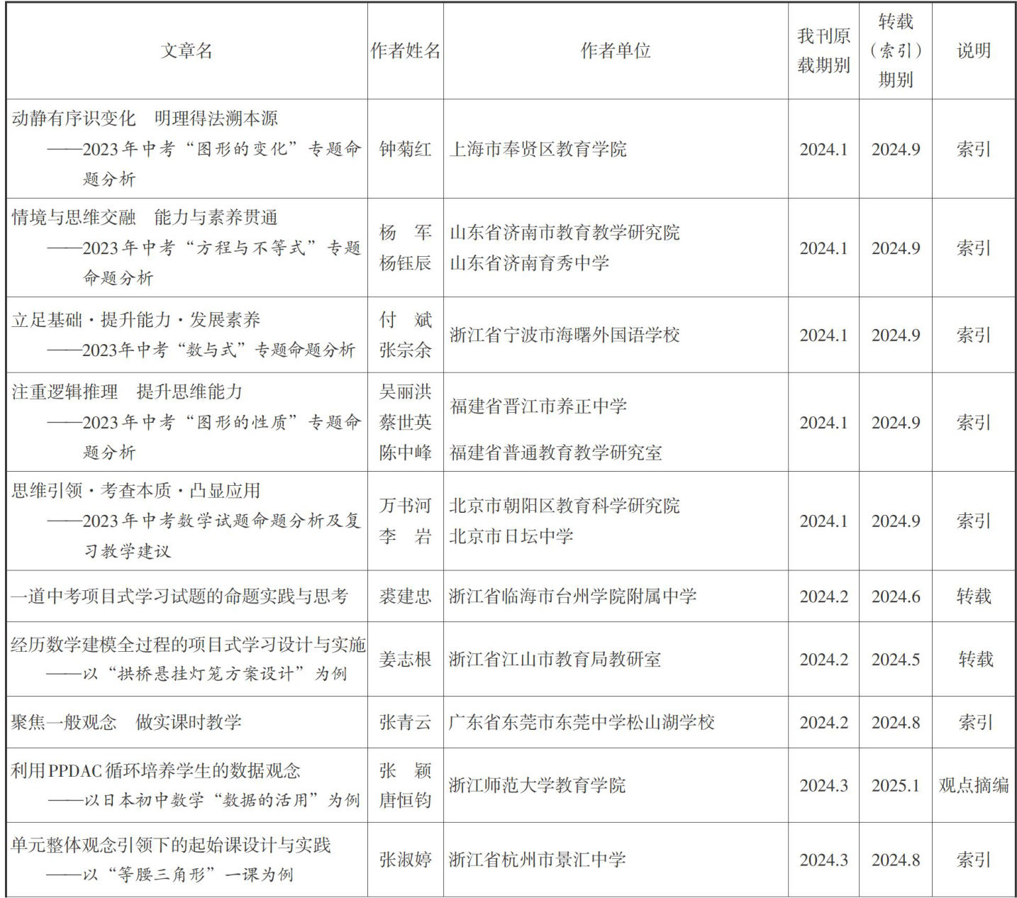 中国人民大学《复印报刊资料(初中数学教与学)》全文转载或索引我刊2024年文章统计