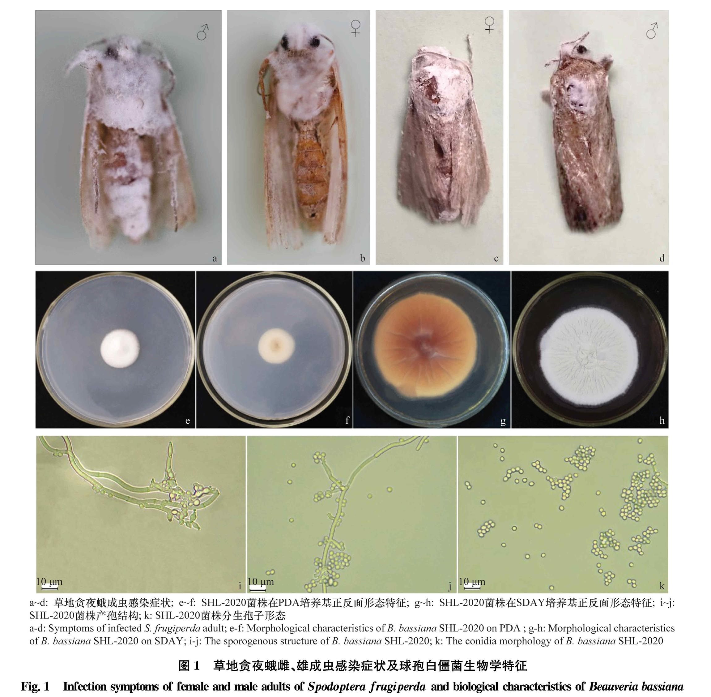 草地贪夜蛾Spodoptera frugiperda(J. E. Smith)是一种全球性重大玉米害虫,于2019年入侵我国云南。2020年8月,从云南省大理弥渡西庄村玉米田采集被虫生真菌感染的草地贪夜蛾雌成虫,经在室内分离培养,结合病原菌分生孢子与菌丝等形态及ITS序列相似性分析,确定感染草地贪夜蛾成虫的真菌为球孢白僵菌Beauveria bassiana,菌株编号为SHL2020。(剩余11348字)